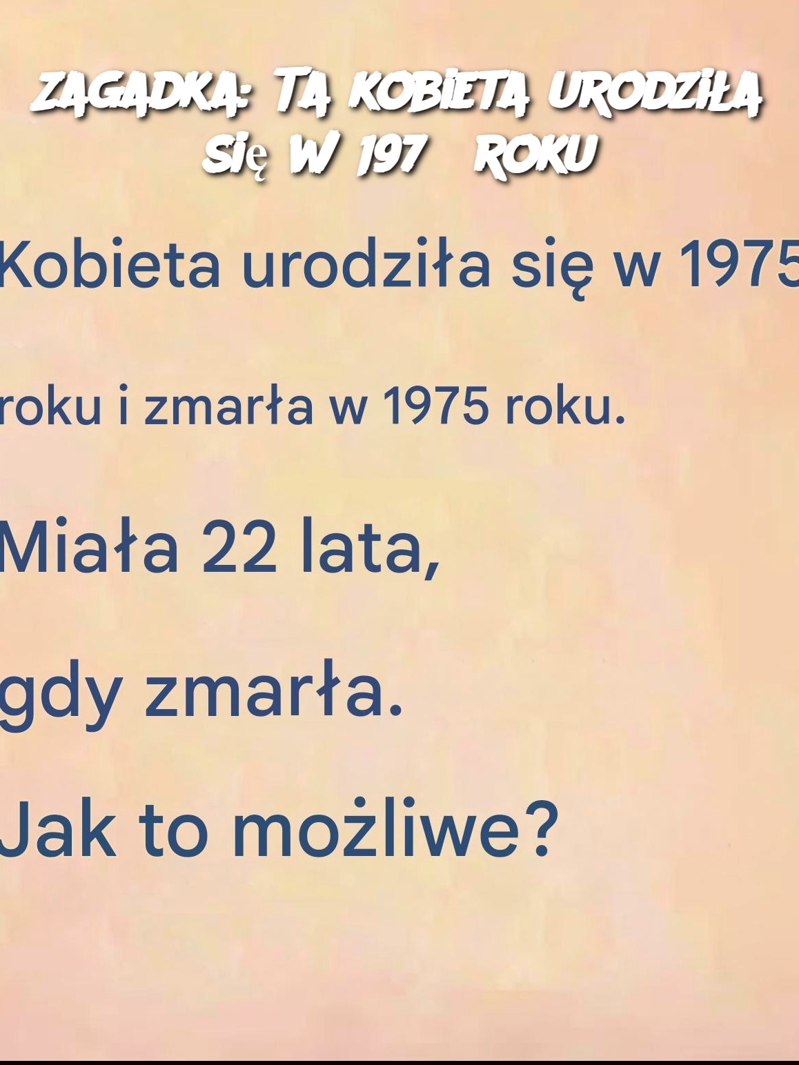 Czy właśnie to przeczytałeś? Wyobraź sobie: przeglądając kanał aktualności natrafiasz na to dziwne zdanie. „Kobieta urodziła się w 1975 roku i zmarła w 1975 roku. Miała 22 lata. To zatrzymuje cię w miejscu. Niezrozumiały? Niepokojące? Oczywiste jest, że gdzieś jest pułapka… Ale gdzie? Trzymaj się mocno, bo ta zagadka wystawia na próbę naszą logikę, nasze … Read more